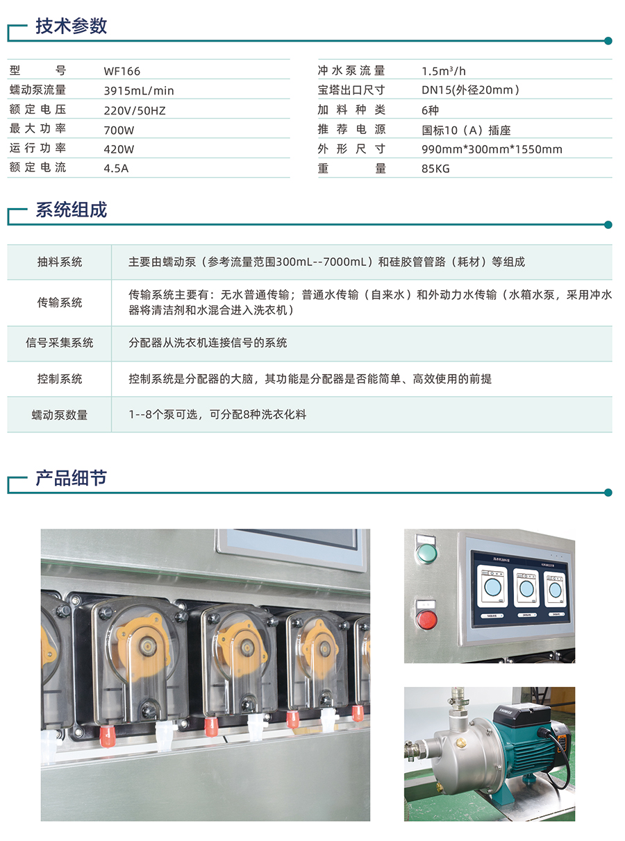 5) 蠕動泵數(shù)量:1--8個泵可選,可分配8種洗衣化料。